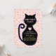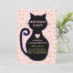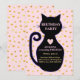 Invitation d'anniversaire avec un chat mignon et des pois dorés sur fond rose. Tous les textes et les nombres sont prêts à être personnalisés.