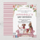 Des chiots mignons avec des chapeaux d'anniversaire et des cadeaux. Le célébrant est assis sur un canapé rose. Dans les coins supérieurs se trouvent des arrangements floraux colorés. Le fond est blanc