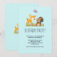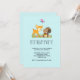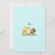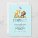 Une invitation à une fête d'anniversaire avec une illustration mignonne représentant un faon et un petit écureuil tenant un gland et un papillon volant au-dessus de leur tête. Ces adorables créatures de la forêt sont debout sur de l'herbe avec des champignons fantaisistes à leurs pieds. Fond bleu clair.