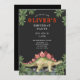 Une invitation à la fête d'anniversaire de dinosaures avec une marche de dinosaure entourée de feuilles de palmiers primitifs. Scène de l'aube du temps, avec typographie colorée en vert rouge et blanc sur un arrière - plan noir. Noir à l'arrière de l'invitation.