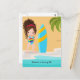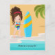 Invitation d'anniversaire de fête de plage estivale de fille présentant une mignonne petite fille surfeuse brune personnalisable à vos spécificités.