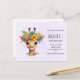 Carte postale d'invitation d'anniversaire avec une illustration aquarelle fantaisiste représentant un visage de girafe portant une jolie couronne florale de printemps. Coloré et mignon.