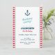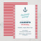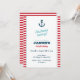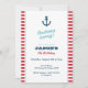 Invitation de fête d'anniversaire moderne avec une illustration d'ancre et un arrière - plan rayé rouge. Idéal pour une fête d'anniversaire, un Baby shower ou une célébration à thème nautique.