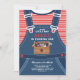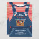 Invitation de fête d'anniversaire mignon, avec d'adorables couloirs bleus, une chemise à rayures rouges et blanches et une boîte à outils pour le petit aide de papa.