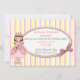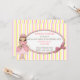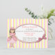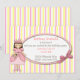 Invitation d'anniversaire de princesse pour une jolie fille, réalisée sur un fond rayé blanc, rose et jaune. Une zone de texte ovale est située au-dessus, avec des graphiques d'un nœud rose, sur le côté droit et des graphiques primitifs de campagne d'une princesse fille, sur le côté gauche. Personnalisez le texte pour l'anniversaire de votre enfant. Votre fille se sentira comme une vraie princesse, avec ces douces invitations à sa fête. Produits assortis disponibles.