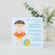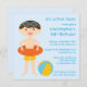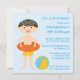 Cette invitation de fête d'anniversaire des garçons 5.25x5.25 a un thème mignon de piscine. Il y a un garçon se tenant avec un tube de natation autour de sa taille à côté d'un ballon de plage. Vous pouvez facilement customiser votre information de partie du côté droit. Illustration créée par conception de Babystar