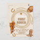 Les invitations d'anniversaire de thème de rodéo pour enfants sont spéciales, et cette invitation peut aider à rendre une fête d'anniversaire mémorable. Calligraphie élégante sur fond de lasso entourée d'accessoires de cowboy : chapeau, fer à cheval, selle, badge de shérif et bottes avec éperons.