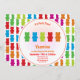 Une invitation pour l’anniversaire d’un enfant avec cinq ours de gymnastique sur le devant. L'invitation Est horizontale avec un motif arrière - plan de l'ours gummy. Tous les mots peuvent être customisés.