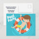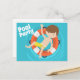 Incroyables invitations de fête au bord de la piscine pour l'anniversaire des enfants en été. Un garçon brun cool avec un tube intérieur rayé rouge et blanc dans les vagues bleues amusantes de la piscine. Pourrait également être utilisé pour un dernier jour d'école, une fête de quartier pour accueillir l'été !