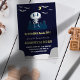 Cette invitation d'anniversaire Halloween 2ème anniversaire en noir avec ces mignons crânes kawaii (squelette), chauves-souris volantes et ces rayures mignonnes au dos, est pour bébé garçon (enfants - genre neutre). (Personnalisez les informations : Notre petit boo a deux ans. Rejoignez-nous pour le deuxième anniversaire spéctaculaire d'Alexander XXXXX octobre XX... )