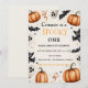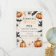 Ajoutez votre propre texte à cette invitation d'anniversaire Halloween effrayante et mignonne ! Caractéristiques des fantômes souriants, des chauves-souris, des citrouilles et des étoiles sur un fond blanc — parfait pour les enfants et les familles qui aiment l'amusement et la frayeur.