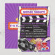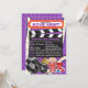 Avec des bobines de film rétro et du film et du pop-corn, du soda, des billets et des lunettes 3D. Cette invitation est disponible en différentes couleurs de fond, notamment rose, violet et rouge.