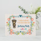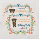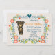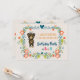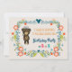 Une invitation de fête d'anniversaire que vous pouvez personnaliser avec vos propres détails. Conçue avec une illustration mignonne d'un ours brun de dessin animé tenant une marguerite jaune. 'Bonjour' écrit au-dessus de sa tête. Entouré d'une couronne de fleurs décorative avec des fleurs, des brindilles, des feuilles et des cœurs. Palette de couleurs d'automne.