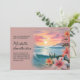 Carte d'invitation pour l'anniversaire des femmes avec une peinture à l'aquarelle d'un beau coucher de soleil sur une plage bordée de palmiers tropicaux et de fleurs.