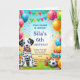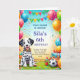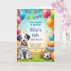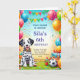 Une invitation d'anniversaire joyeuse et colorée présentant un chiot Dalmatien de dessin animé joueur assis parmi des cadeaux emballés, un ballon de football et des jouets. Le fond est d'un blanc éclatant avec des décorations festives pastel comprenant des ballons, des confettis et une guirlande de drapeaux triangulaires en haut. L'esthétique générale est légère, joyeuse et adaptée aux enfants. Le texte est centré et disposé de manière claire dans un mélange de polices sans-serif modernes et de polices script ludiques, avec des espaces réservés pour le nom, l'âge, la date, l'heure, le lieu et les détails de RSVP.