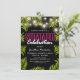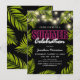 Cartes d'invitation pour anniversaire d'été avec un fond noir élégant qui peut être changé en n'importe quelle couleur, guirlandes lumineuses, feuilles de palmier tropicales, enseigne néon rose et blanc, et un modèle de fête moderne qui peut être facilement personnalisé.
