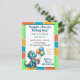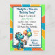 Invitations d'anniversaire personnalisées adorables pour garçons. Joli thème de dinosaure en bleu, orange et vert. Adorables dinosaures de dessin animé tenant des ballons et un gâteau d'anniversaire.