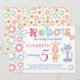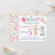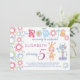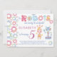 Carte d'invitation personnalisée pour anniversaire d'enfant avec des robots et engrenages pastel rose, bleu et orange et une typographie colorée amusante. Convient pour les garçons et les filles.