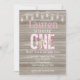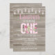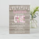 Adorable invitation de premier anniversaire avec un thème rustique et chic shabby. l'arrière - plan a un arrière - plan en bois, et le mot "ONE" est placé au milieu avec un motif rose shabby chic. Une mignonne bannière avec des lumières de mâchoires est suspendue au sommet.