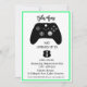 Jeu thème Invitation d'anniversaire pour les garçons. Couleurs vert citron, bleu et gris. Contrôleur, casque, niveau vers le haut.