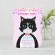 Carte d'invitation d'anniversaire avec un charmant chat en smoking comme messager et des ballons multicolores en en-tête sur un fond dégradé rose. Tout le texte est prêt à être personnalisé.