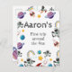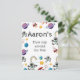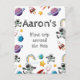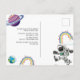 Cartes d'invitation pour la première fête d'anniversaire dans l'espace avec un fond de ciel étoilé, des planètes du système solaire dispersées autour du bord, une fusée, un astronaute et un modèle moderne de célébration du 1er anniversaire facile à personnaliser.