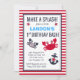 Faites un plongeon pour un bain d'anniversaire avec cette adorable invitation nautique ! Présente de mignons crabes, étoiles et ancre avec un arrière - plan rayé rouge et blanc.