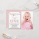 Une belle et moderne invitation photo pour le premier anniversaire que vous pouvez personnaliser et envoyer à vos amis et à votre famille pour célébrer l'anniversaire. Le texte est défini dans une typographie populaire. Remplacez la photo d'exemple par la vôtre. Les couleurs de texte rose, vert et noir peuvent être modifiées à l'aide du menu d'édition. Le motif à rayures blanches et roses orne le dos de la carte. D'autres couleurs et motifs sont disponibles.