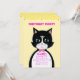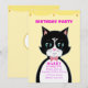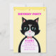 Carte d'invitation d'anniversaire avec un chat smoking mignon comme messager sur fond jaune clair. Tout le texte est prêt à être personnalisé.