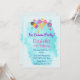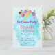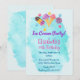 Une invitation d'anniversaire sur le thème sucré et rafraîchissant de l'été. Le fond est une éclaboussure de peinture bleu turquoise léger et aéré. Illustré avec des cônes de glace roses et violets, une sucette et une glace colorée ainsi que quelques bonbons boutons. Personnalisez avec les informations de votre fête.