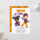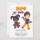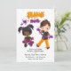 Carte d'invitation d'anniversaire de fête de science de slime mignonne avec un schéma de couleur violet et orange tendance personnalisable à vos spécificités.