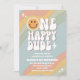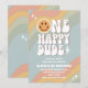 Célébrez l'étape importante de votre petit avec cette invitation d'anniversaire rétro pastel de 1ère année, mettant en vedette des bandes ondulées ludiques, une typographie audacieuse et des détails fantaisistes comme des icônes souriantes et des étincelles. Parfait pour un thème de fête amusant et nostalgique, cette carte personnalisable donne le ton à la paix, l'amour et la joie. Conçue pour impressionner les invités et optimisée pour la visibilité de recherche, elle est idéale pour les parents qui planifient une célébration élégante et mémorable.