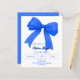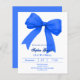Un arrière - plan blanc, décoré d'un grand arc bleu royal. Personnalisez et ajoutez un nom et des détails du parti. 1 feuille = 1 invite imprimé bord à bord.