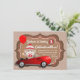 Cartons d'invitation de fête d'anniversaire de singe chaussette avec un adorable singe chaussette dans une voiture rouge mignonne sur un fond à pois rouge et marron. Cette invitation d'anniversaire de singe chaussette est facilement personnalisable pour votre événement en ajoutant simplement votre année et les détails de l'événement.