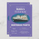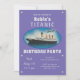 Titanic Purple Invitation Anniversaire Customisez ce design amusant d'Anniversaire Titanic en personnalisant le nom de la meilleure fête jamais! Les jeux et les fournitures de parties de coordination avec ce design sont disponibles dans la collection de fête d'anniversaire de Titanic Oval. Disponible sur les couleurs amusantes suivantes pour vêtements pour enfants, ados et de famille, jeux et accessoires : Heroic Yellow, Starfire Red, Devenez écolo, Raven Black, Robin Orange Red et Phantom Purple. Ce design graphique présente ma peinture à l'huile originale, copyright 2/1995.