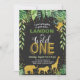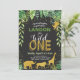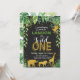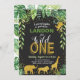 Green and gold Tropical Wild One Birthday Invitation Jungle Safari Animaux avec éléphant, girafe, singe et lion.