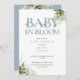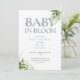 Bébé en fleurs invitation baby shower avec élégante typographie bleu poussiéreux et joli feuillage botanique verdoyant et votre code QR au verso. Conçu par Thisisnotme©