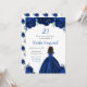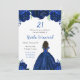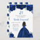Cette invitation à la fête d'anniversaire présente des fleurs bleu marine de parties scintillant faux et une belle princesse à la peau foncée et une robe élégante. C'est parfait pour une fête d'anniversaire.