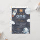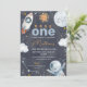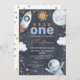 Dark Space Premier voyage autour du Soleil 1er Anniversaire Invitation Sweet l'espace extérieur ou premier voyage autour du Soleil première invitation pour un bébé garçon avec un petit soleil, planète, étoiles, vaisseau spatial et vaisseau spatial sur un arrière - plan sombre. Le premier voyage de ce garçon autour du soleil est idéal pour une fête de premier anniversaire thématique.