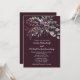 This wedding invitation showcases a rich, dark wine background that sets a tone of elegance and depth. At the top, a graceful floral arrangement unfurls in a mix of dusty purple blooms, soft lavender accents, and muted sage green leaves. The palette feels romantic and refined, with each shade contributing to a sense of quiet sophistication.