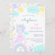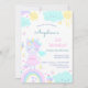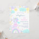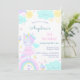 Invitation de 3ème anniversaire avec une drôle de licorne, qui est entouré de photos mignonnes d'un arc-en-ciel, nuage, soleil, glace.