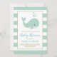Cette douce invitation à baby shower sans sexe présente une jolie baleine verte à la menthe qui crache des gouttes d'eau bleue. Les mots "Baby shower" et le nom personnalisable de la maman-to-be apparaissent dans la police d'écriture bleue correspondante. Au-delà du cadre rectangulaire en faux or est un arrière - plan de rayures vert menthe et blanc. Idéal pour un baby shower de navigation nautique, baleine ou sous-marin.