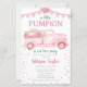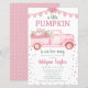 Cette adorable, fille, invitation de baby shower budget 5,5" x 8,5" avec un pick-up rose aquarelle chargé de citrouilles rose et blanc avec des détails de parties scintillant or et des sprays d'eucalyptus et fleurs roses multi-hued avec feuilles de parties scintillant or serait parfait pour votre douche! C'est fabuleux pour un baby shower d'automne ou de temps de récolte. Il a un dos rose doux coordonné avec de minuscules pois blancs. Tellement mignon pour accueillir un nouveau bébé doux !