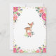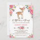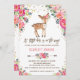 Invitation à baby shower sur le thème de la forêt illustrant l'adorable illustration d'un chevreuil entouré d'un feuillage vert rustique et de fleurs vertes et roses chaudes