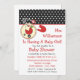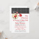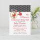 Une invitation de baby shower pour des professeurs comportant une frontière supérieure de petit pois blanc au-dessus de noir avec l'équilibre rouge. La goupille rouge de couche-culotte attachée à la frontière supérieure et le cercle forment avec la voiture d'enfant rouge de pomme à l'intérieur. Personnalisez le texte rouge et noir avec des détails de votre occasion.