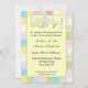 Invitation Baby shower avec patchwork quilt bordures de rayures, pois et chèques dans de jolies couleurs pastel et le mot "bébé" dans le même motif. Les invitations sont faciles à customiser et sont fournies avec enveloppes et votre choix de papier.