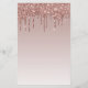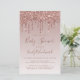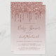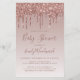 Cette invitation baby shower branchée présente une bordure d'or rose scintillant dégoulinant de la fausse parties scintillant sur un arrière - plan rose à l'ombre d'or. Les mots "Baby shower" et le nom de la maman-to-be apparaissent dans un script d'écriture rose foncé, avec le texte restant dans la police sans serif.