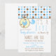 Une invitation baby shower avec une bordure supérieure d'un motif à pois bleu et marron avec garniture brune. Pince à couches bleues attachée à la bordure supérieure et en forme de cercle avec le transport de bébé bleu à l'intérieur. Personnalisez le texte bleu et marron avec les détails de votre occasion.