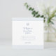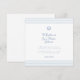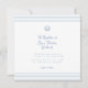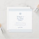 Une invitation de baptême carrée classique mais moderne en bleu blanc, avec des bandes subtiles en haut et en bas, une coquille peinte à la main avec une croix, et une police de caractères cursive douce pour un look élégant et significatif.