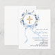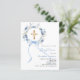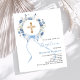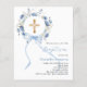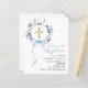 Un fond blanc élégant, orné de fleurs bleues peintes à l'aquarelle en forme de couronne, un noeud bleu et une croix dorée. Personnalisez et ajoutez un nom et des détails.